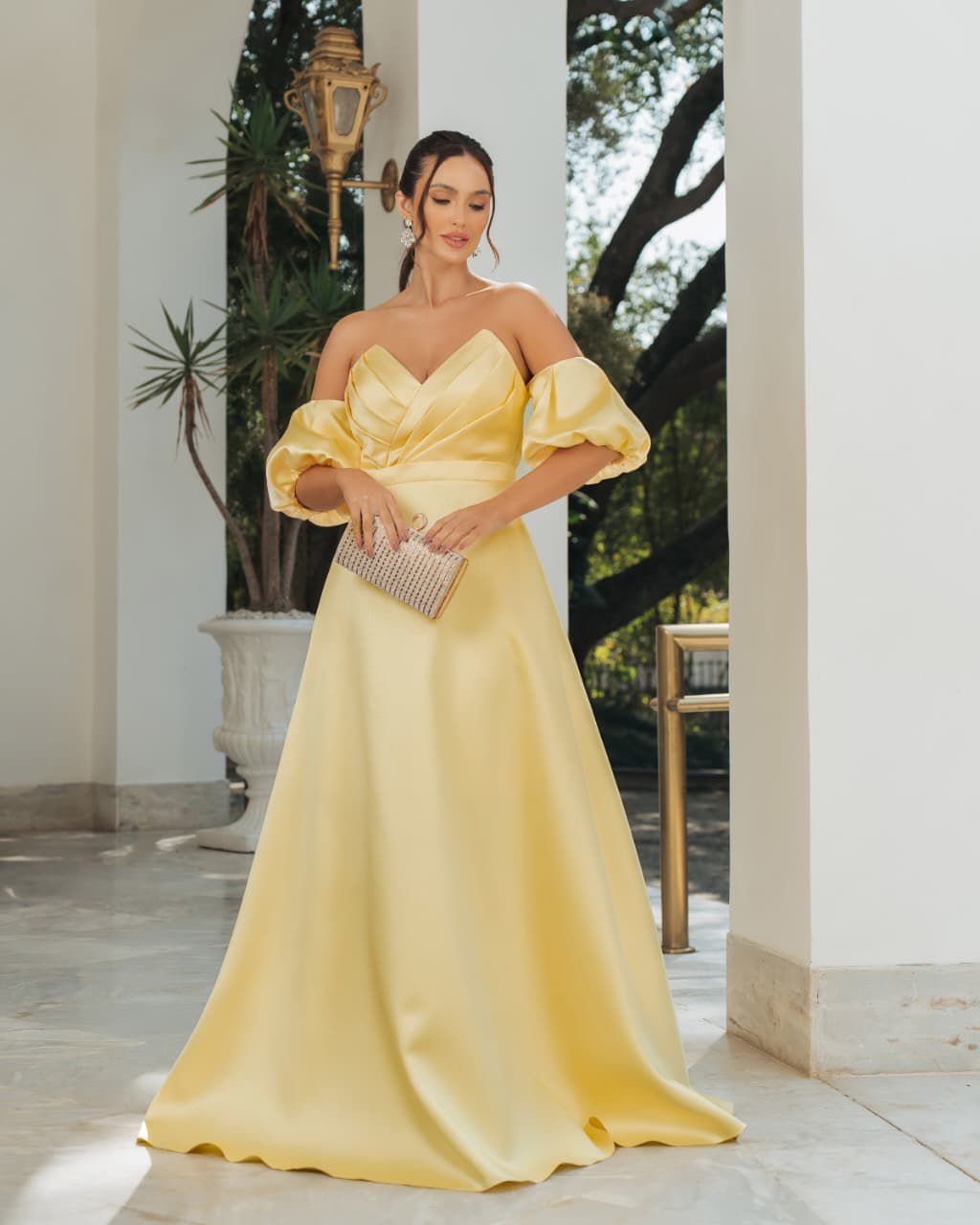 VESTIDO AMARILLO ESTRAPLES MANGA GLOBO TALLE P