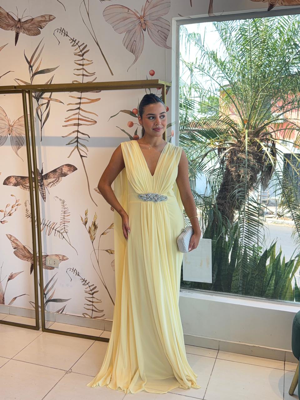 VESTIDO AMARILLO GASA APLIQUE MANGAS CAPA TALLE G