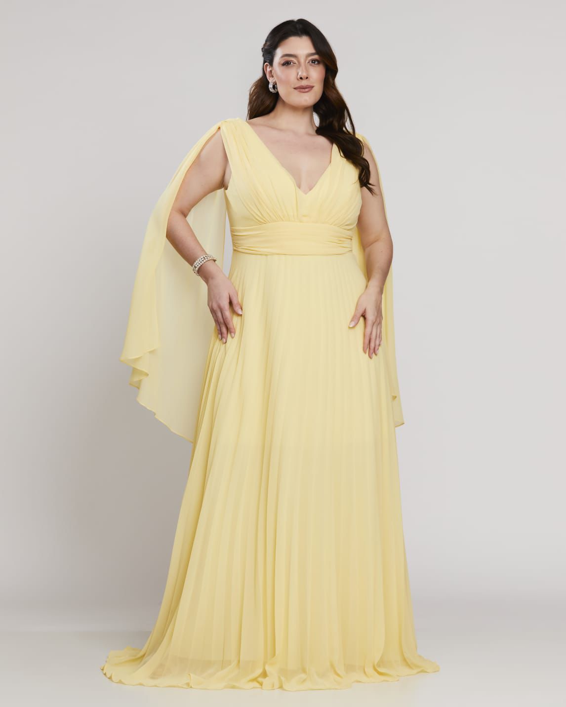 VESTIDO AMARILLO PLIZADO MANGA CAPAS TALLE XG