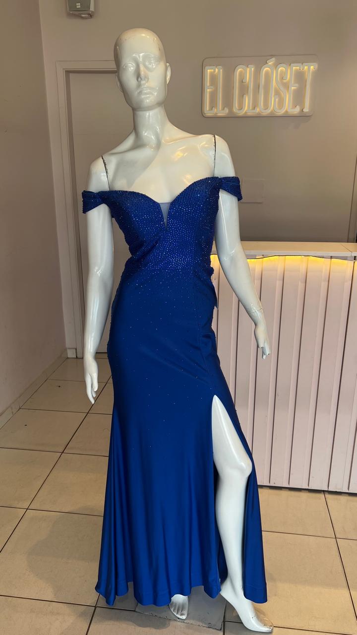 VESTIDO AZUL MANGAS CAIDAS STRAS TALLE M