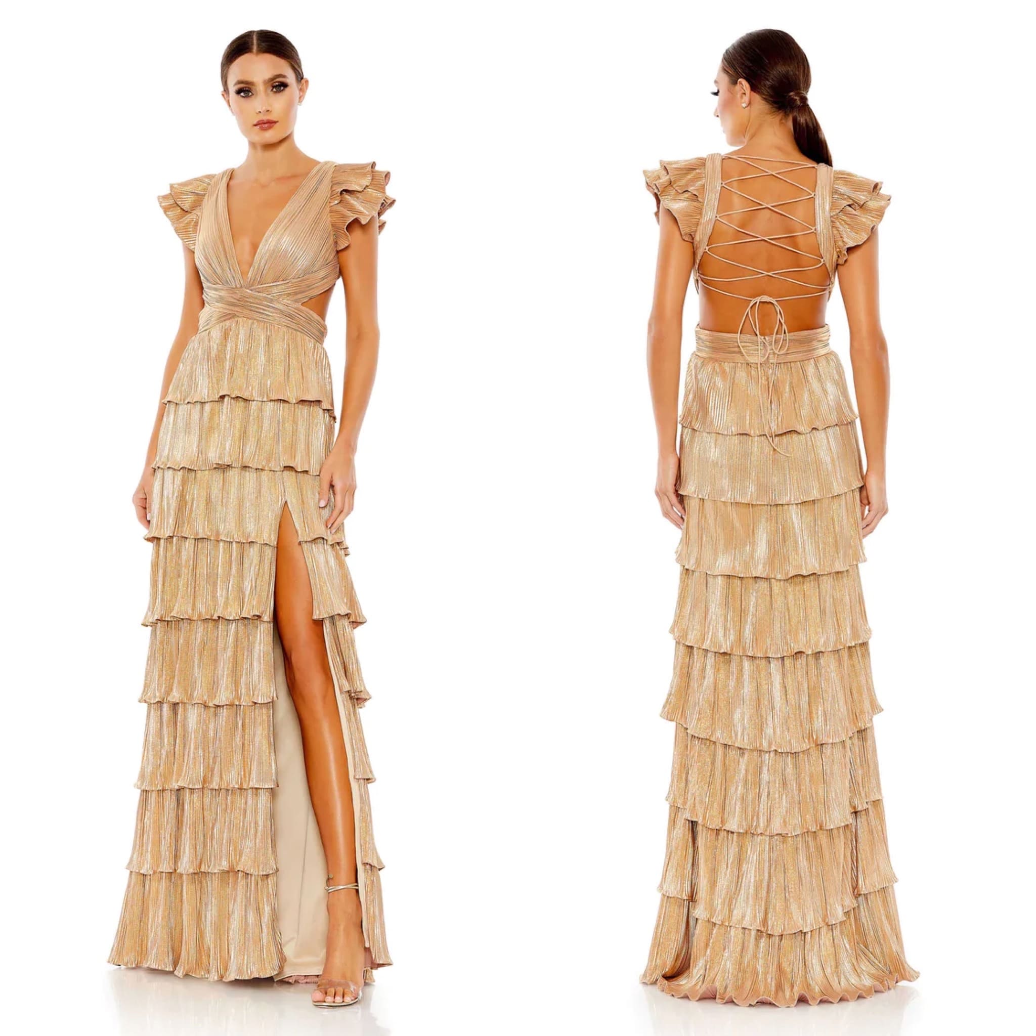 VESTIDO BEIGE CAPAS ESPALDA CRUZADA Y TAJO TALLE PÂ