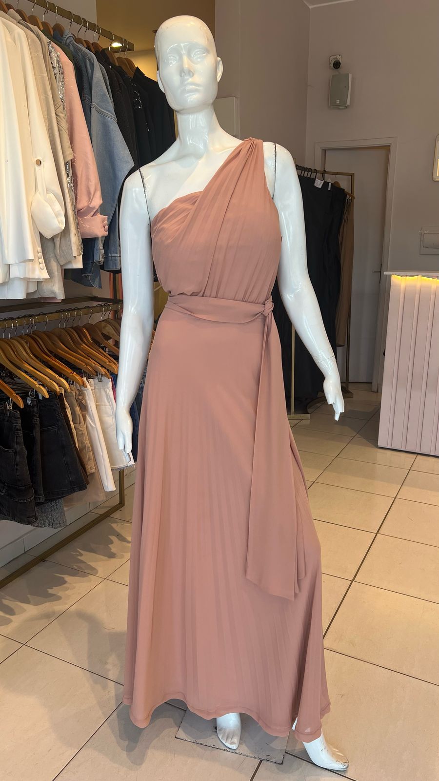 VESTIDO BEIGE PLIZADO UN HOMBRO TALLE G