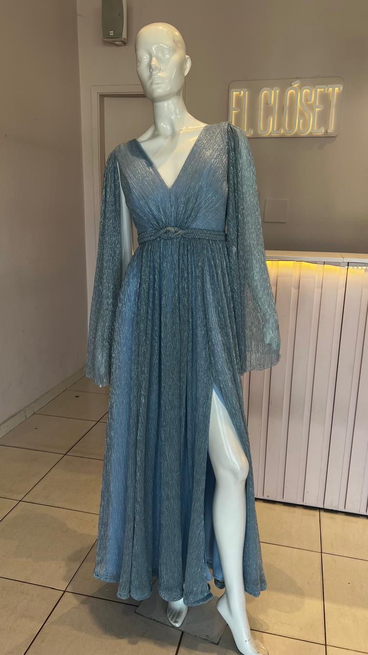 VESTIDO CELESTE BRILLOSO CAPAS MANGA TALLE M