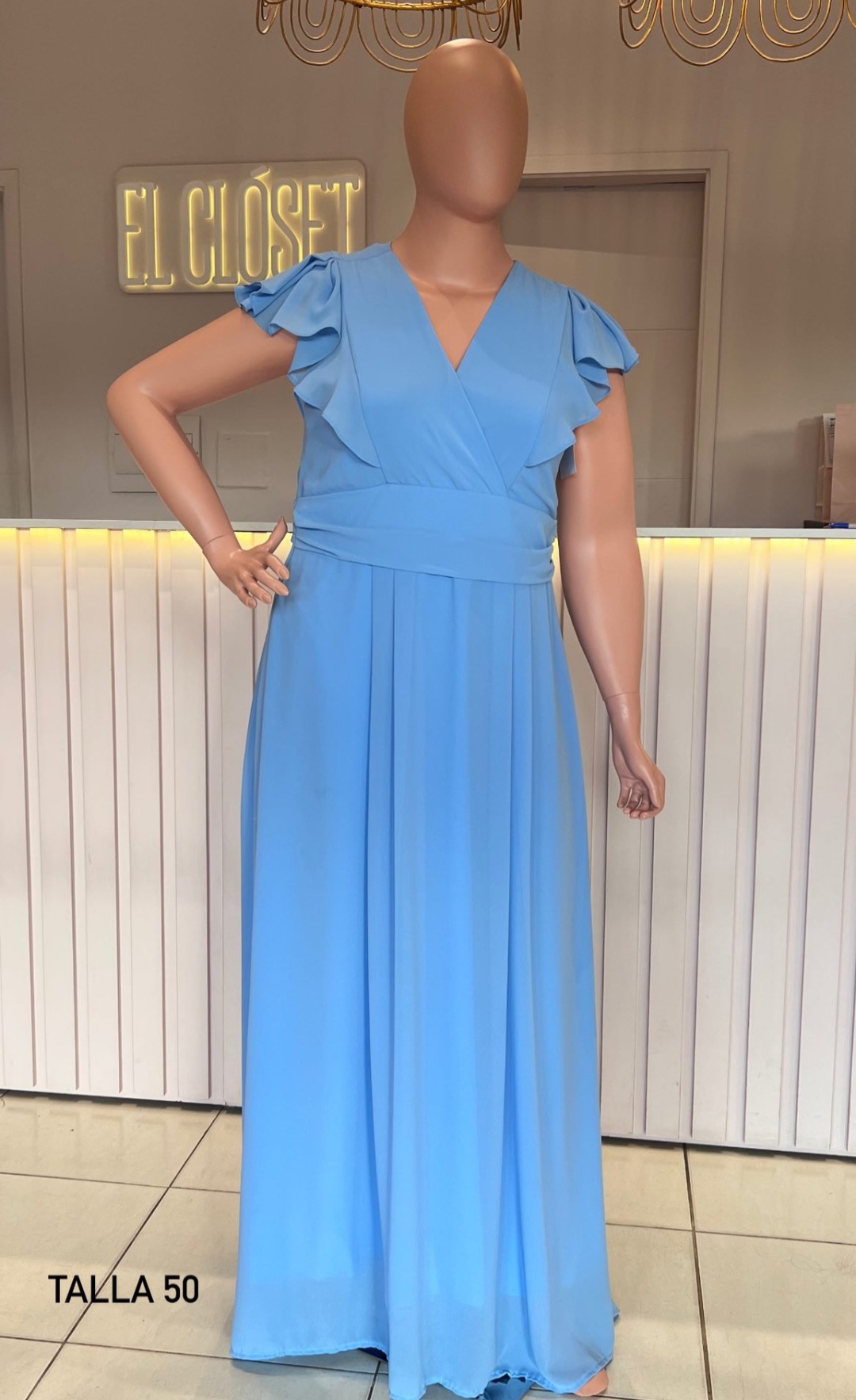 VESTIDO CELESTE HOMBRO VOLADOS TALLE XG