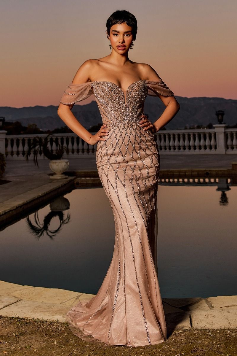 VESTIDO DORADO BRILLOSO BORDADO EN PECHO MANGA CAIDA TALLE M