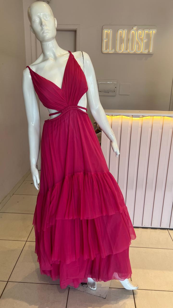 VESTIDO FUCSIA CAPAS TIRAS TRENZAS TALLE M