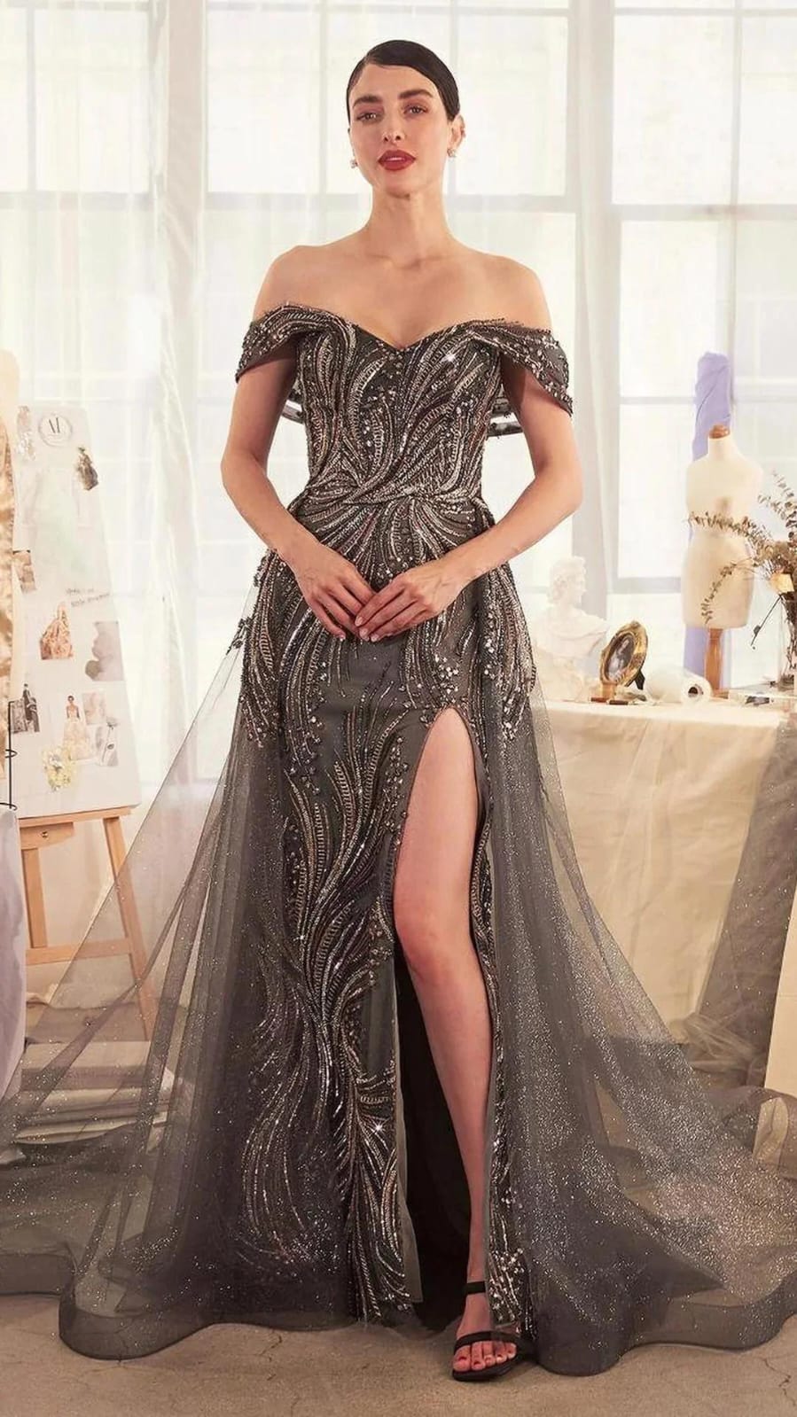 VESTIDO GRIS BORDADO MANGAS CAIDAS TALLE P