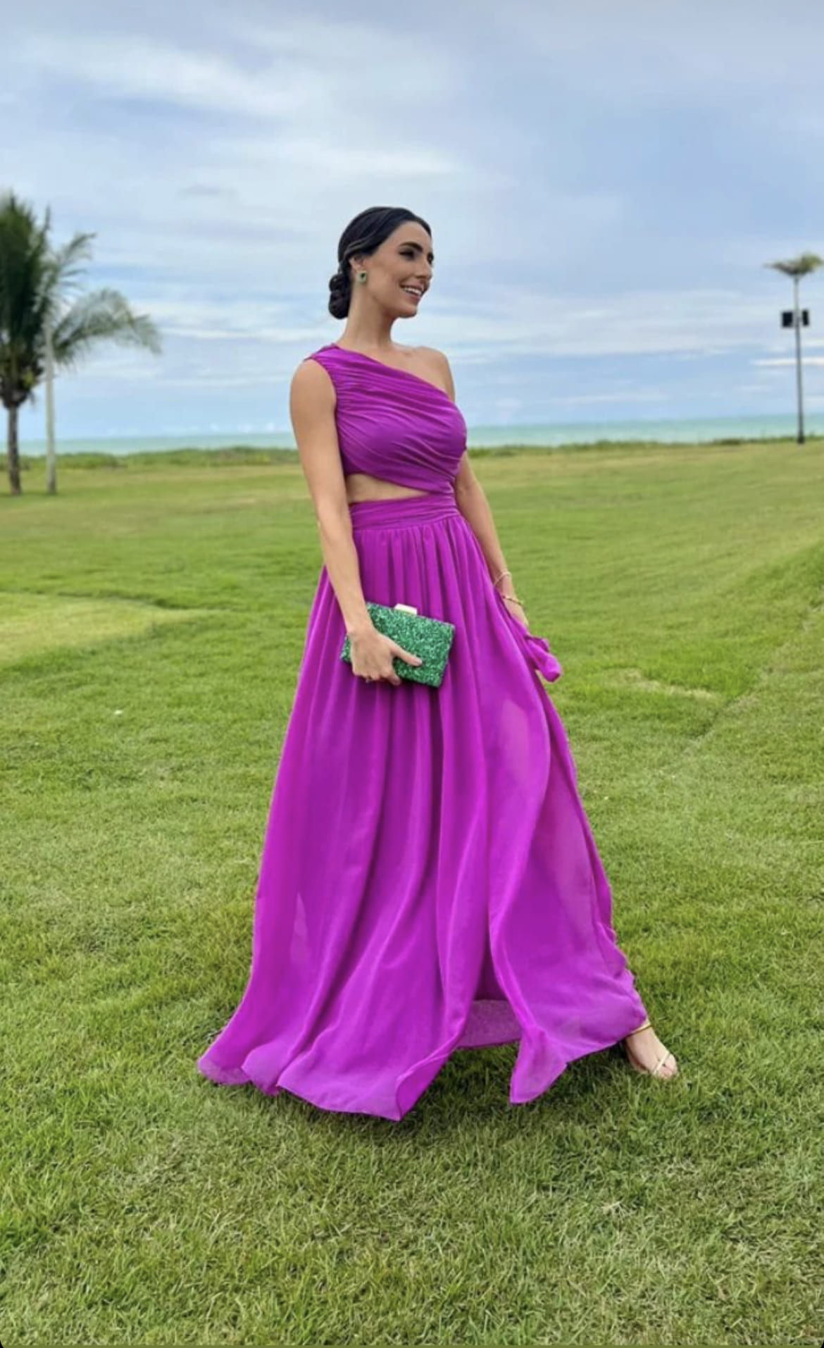 VESTIDO MAGENTA 1 HOMBRO, ABERTURA EN CINTURA TUL ELASTIZADO