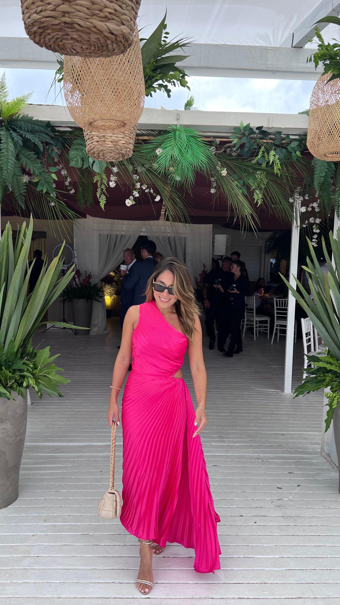 VESTIDO MIDI FUCSIA PLIZADO TALLE P