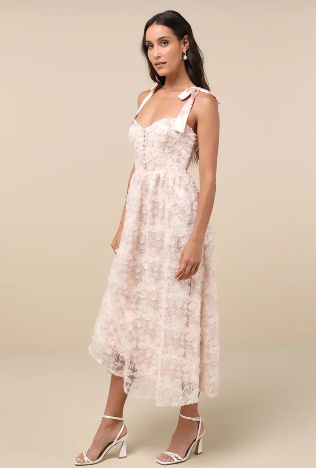 VESTIDO MIDI ROSA ATADO EN HOMBRO FLORES DE TUL TALLE P