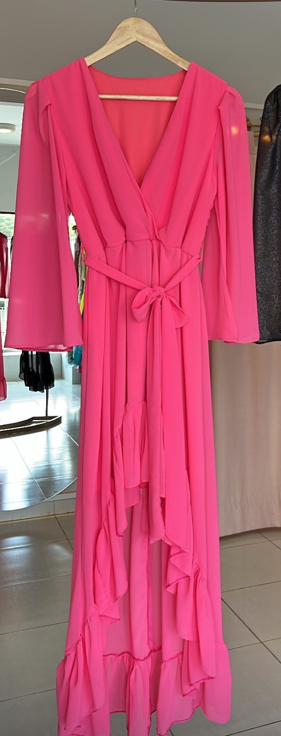 VESTIDO MIDI ROSA CHICLE MANGAS LARGAS TALLE P