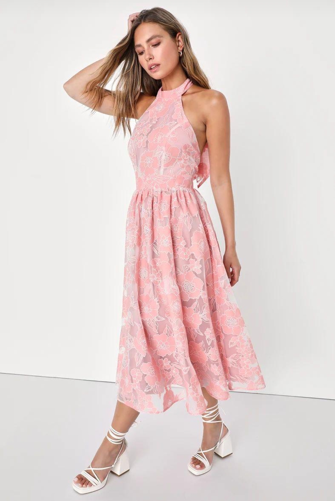 VESTIDO MIDI ROSA CUELLO HALTER TALLE M