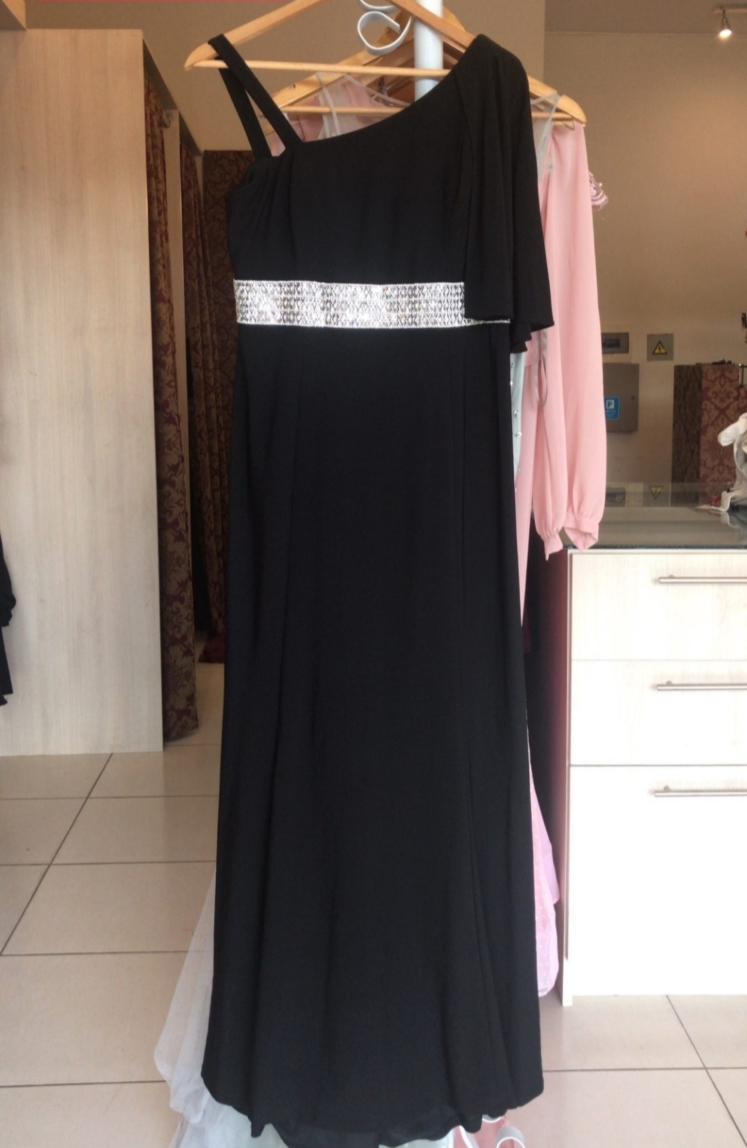 VESTIDO NEGRO UN HOMBRO BRILLO EN CINTURA TALLE G