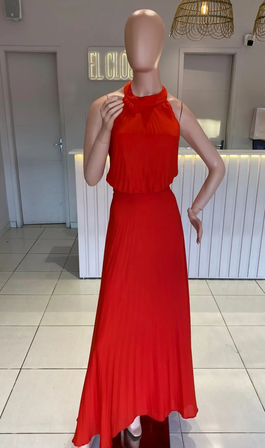 VESTIDO ROJO NARANJA PLIZADO CUELLO HALTER TALLE M