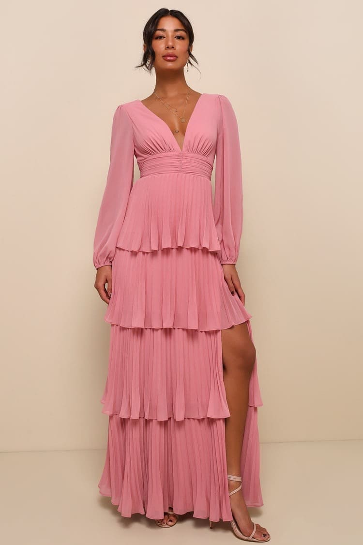 VESTIDO ROSA MANGAS LARGAS, PLISADO Y CAPAS EN FALDA TALLE XP