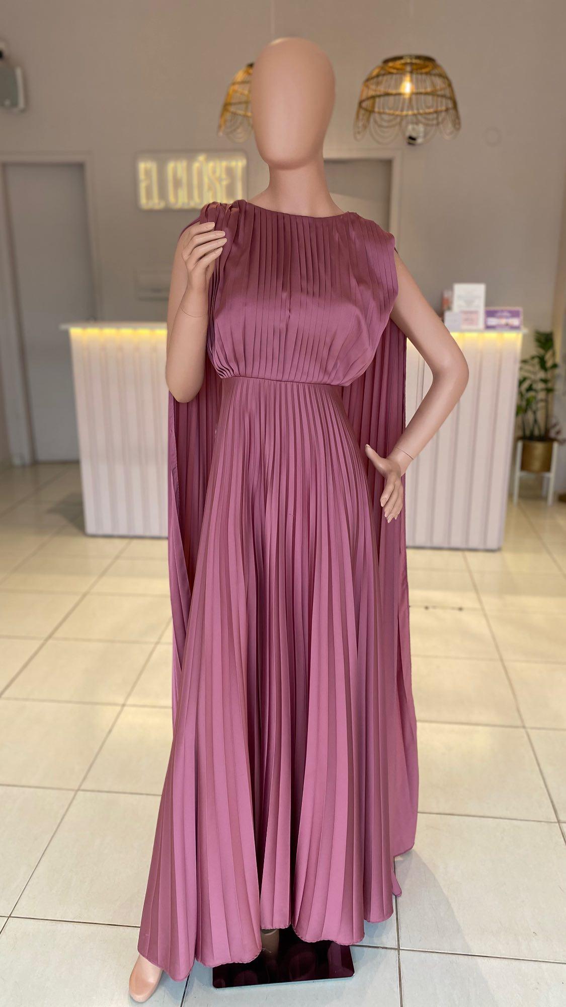 VESTIDO ROSA PLISADO TELMA, CAPA EN HOMBRO TALLE PÂ