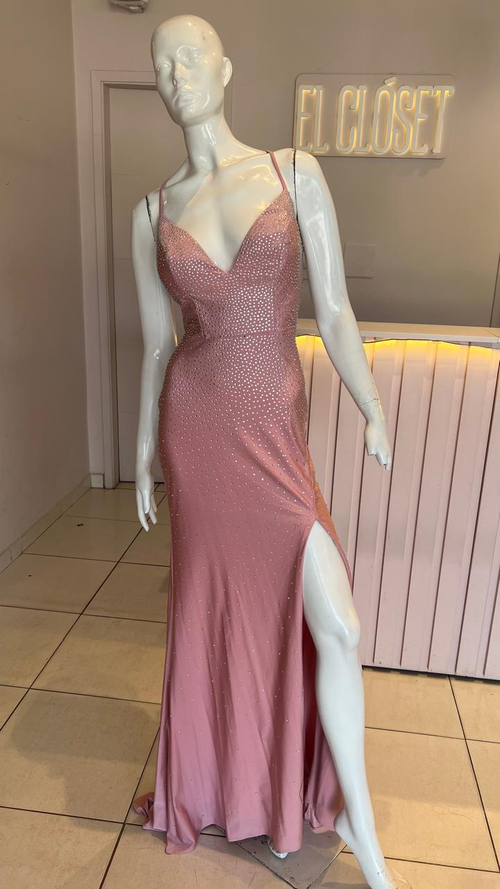 VESTIDO ROSA STRAS ESPALDA CRUZADA TALLE M