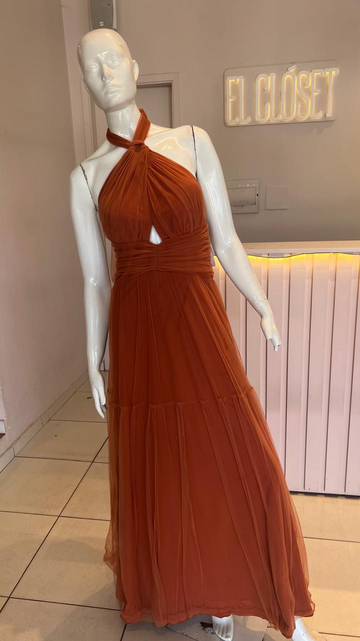 VESTIDO TERRACOTA TUL CUELLO HALTER TALLE M