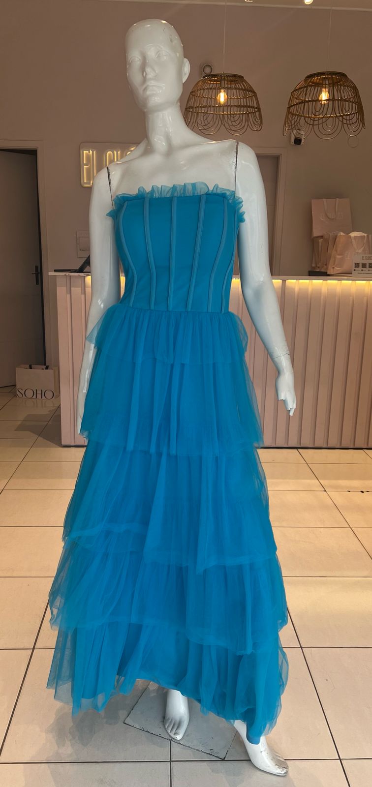 VESTIDO TURQUESA ESTRAPLES CAPAS TUL TALLE G