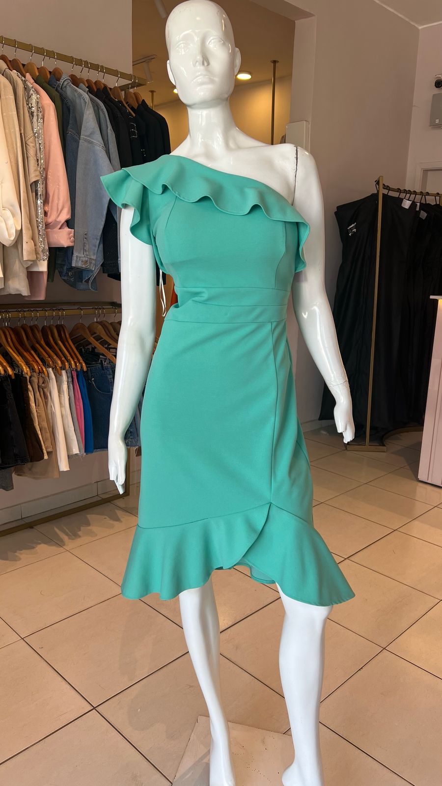 VESTIDO VERDE AGUA UN HOMBRO MIDI TALLE P