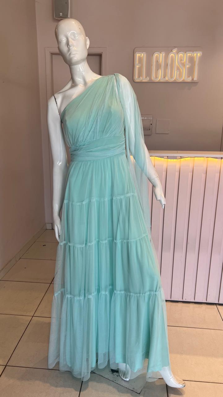 VESTIDO VERDE AGUA UN HOMBRO TALLE M
