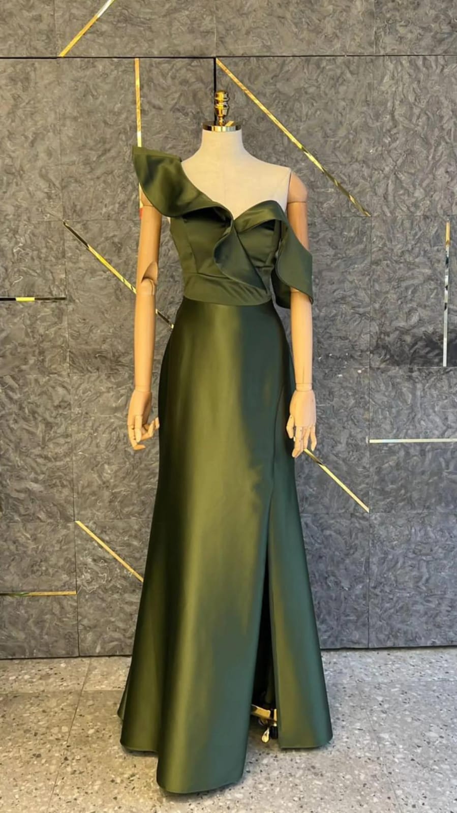VESTIDO VERDE MUSGO HOMBRO VOLADO TALLE M