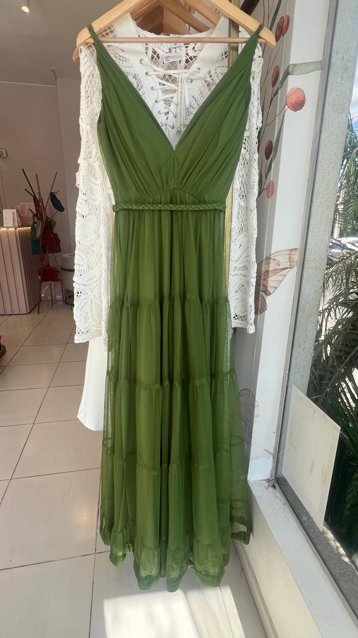 VESTIDO VERDE MUSGO TRENZA EN CINTURA TUL TALLE P