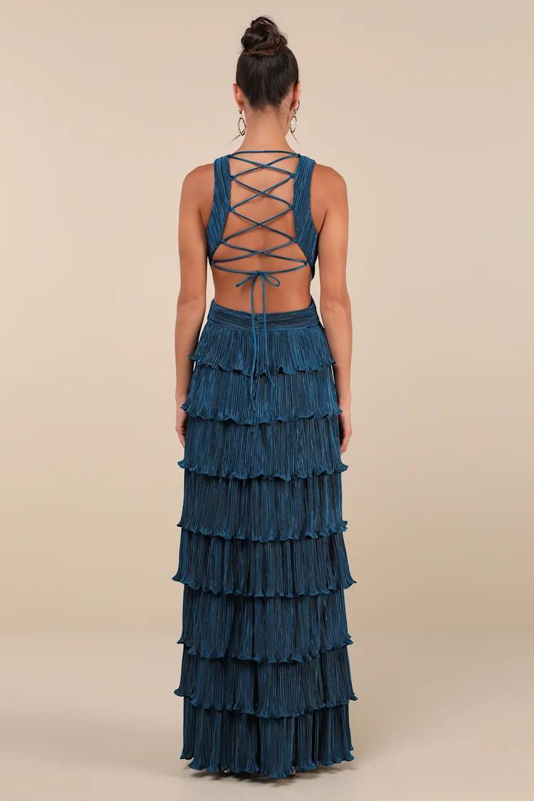 VESTIDO VERDE PETROLEO ESPALDA CRUZADA CAPAS TALLE G