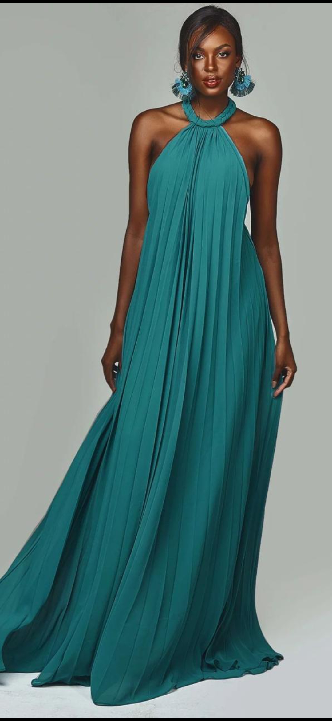 VESTIDO VERDE PETROLEO PLIZATO CUELLO HALTER TALLE M