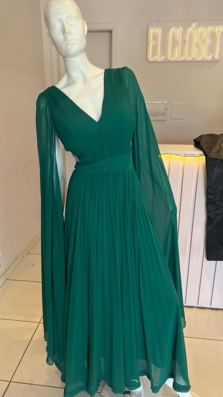 VESTIDO VERDE PLIZADO MANGA CAPAS TALLE M