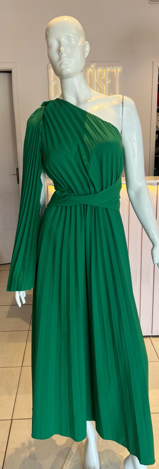 VESTIDO VERDE PLIZADO MIDI UN HOMBRO TALLE G