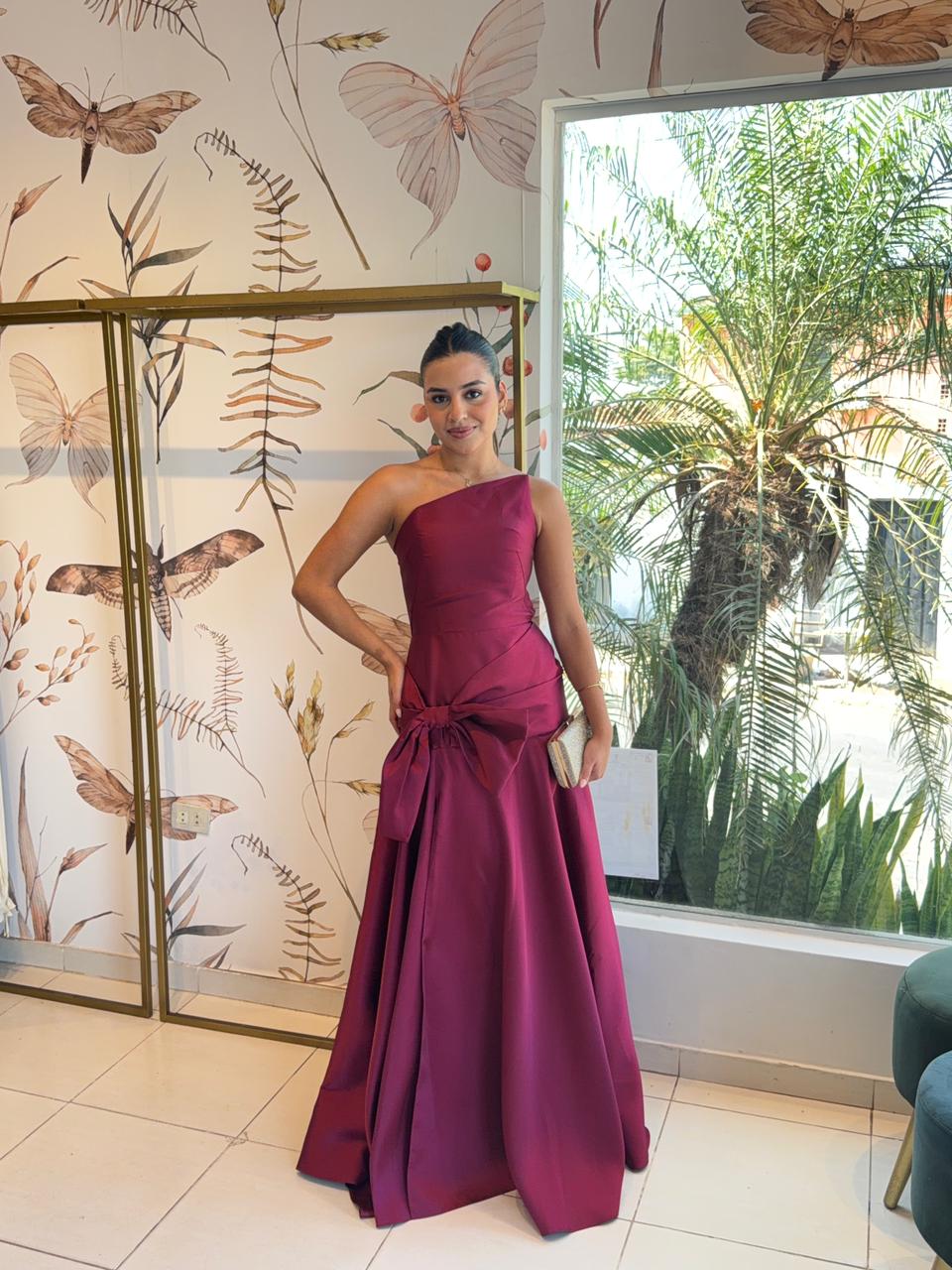 VESTIDO VINO TAFETA CON MOÑO EN CADERA TALLE M